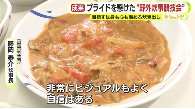 藤岡泰介 炊事長によれば「災害派遣での炊き出しでどんな状況、場所でも簡単に再現できる料理」で、とろみを出すためフランス料理でよく用いるブールマニエを使ってコクのある味わいを生み出すと意気込んだ。