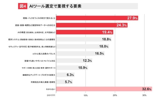 AIを導入する際に重要視する要素は、「現場と事務の両方で使える汎用性」27.9%と一番多く、次いで「図面・画像・帳票など建設特有データへの対応力」24.3%、「既存システムとの連携性」19.4%が続き、建設業の業務に沿うことが重要と考えられます。一方、「わからない」との回答も32.6%に上り、具体的な選定基準に迷う層の多さも浮き彫りとなりました。(図4)