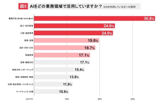 「書類作成」というイメージのしやすいAI活用が36.8%と一番多く、「施工・安全管理」24.6%や「工程・進捗管理」24%といった建設特有の領域での活用が進んでいます。また、積算や設計、原価管理の領域でも約2割となっており、現場からバックオフィスまで様々な領域でAI活用が始まっています。(図5)