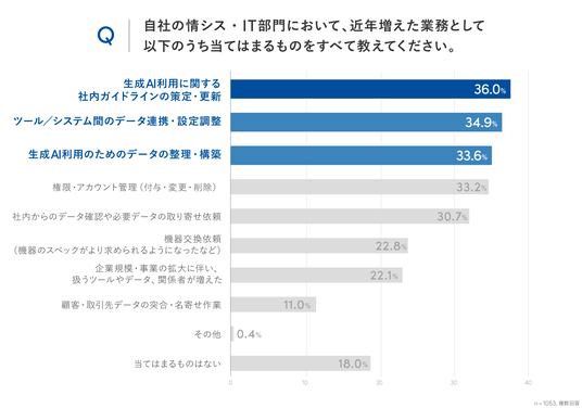 ・特に増えた業務は「生成AI利用の環境整備」および「社内システム・ツール間のデータ連携」