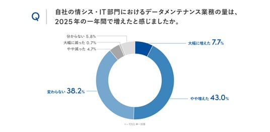 自社の情シス・IT部門におけるデータメンテナンス業務の作業量について、2025年の1年間で増えたかを尋ねたところ、「大幅に増えた」または「やや増えた」と回答した人が合計50.7%にのぼりました。