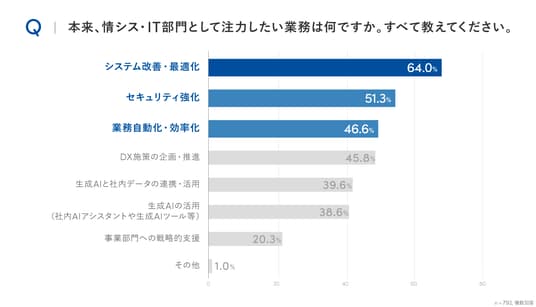続いて、「頻繁にある」または「時々ある」と回答した人に、本来注力したい業務を尋ねたところ、「システム改善・最適化」(64.0%)、「セキュリティ強化」(51.3%)、「業務自動化・効率化」(46.6%)が上位に挙がりました。
