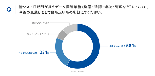 最後に、今後のデータメンテナンス関連業務の見通しについて尋ねたところ、58.1%が「増えていくと思う」と回答しました。生成AI活用やデータ活用の広がりにより、情シス・IT部門が担う業務は、今後さらに増加・高度化していくことが予想されます。
