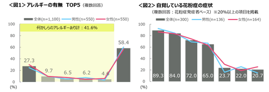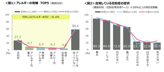 何らかのアレルギー症状がある人は41.6%で、「花粉症」の症状がある人は27.3%と最も多い。<図1>