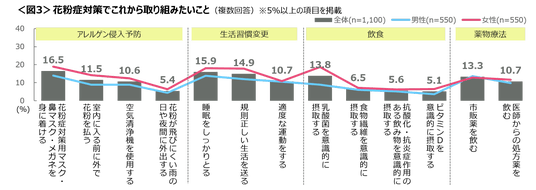 これから取り組みたい花粉症対策は、「花粉症対策用のマスク・メガネの着用」「睡眠をしっかりとる」「規則正しい生活を送る」がTOP3。