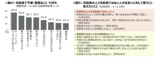 花粉症の人から花粉症ではない人へは、症状が多様にあることへの理解を求める意見、将来の発症を見据えて早期対策を推奨するアドバイスがあがった。