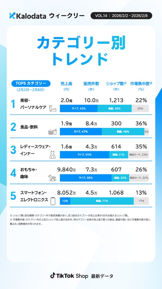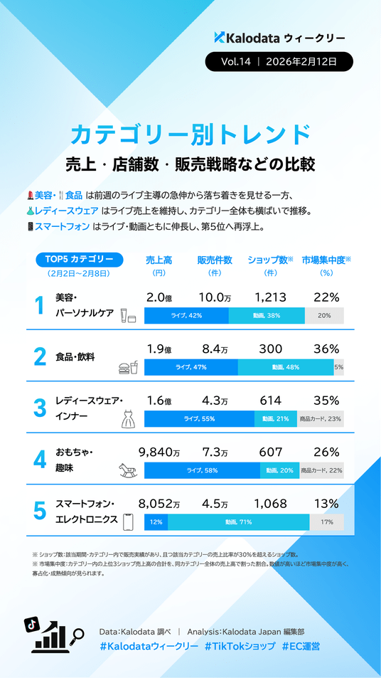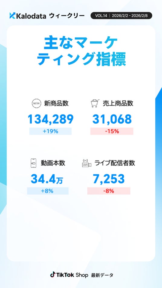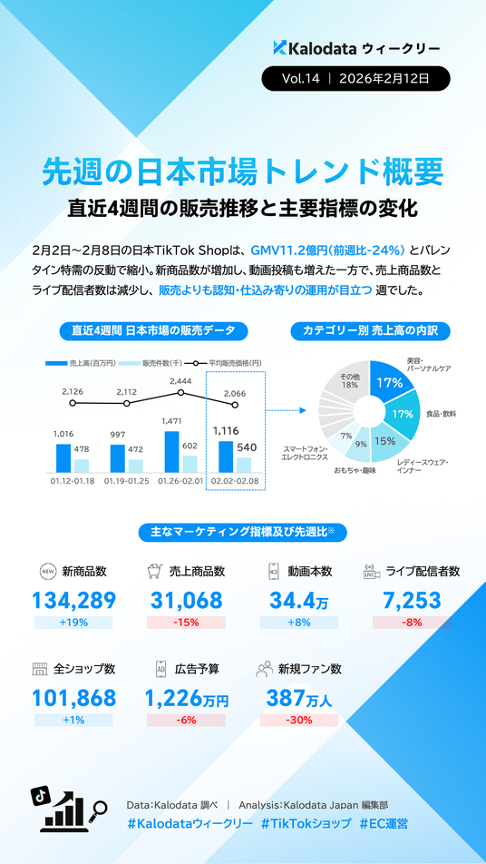 Kalodata Japan(運営:株式会社Kalowave Japan)の最新データ分析によると、2月2日~2月8日の日本TikTok Shopは、GMV11.1億円(前週比-24%)と、バレンタイン特需の反動で縮小しました。新商品数は増加したものの、売上発生商品数は減少しており、供給拡大に対し転換効率が低下した構図が鮮明です。動画投稿は増加した一方でライブ配信者数は減少し、販売加速よりも認知獲得・準備運用に重心が移った週となりました。カテゴリー別では、美容・パーソナルケア及び食品・飲料は前週のライブ主導の伸長から落ち着きを見せた一方、レディースウェア・インナーはライブ売上を維持し横ばいで推移。スマートフォン・