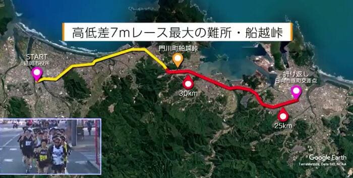 30キロを過ぎて待ち構えるのが、勝負の行方を大きく左右する「船越峠」数々の駆け引きを生んできた長い坂道を登り終えると、再び延岡市へ。栄光のフィニッシュ地点に最初にたどり着くのは、誰なのだろうか。