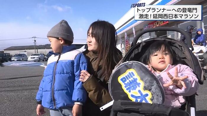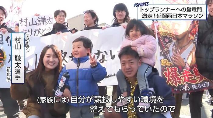 向かい風となった後半、力走する村山選手に家族が沿道から「謙太ファイトー」と声援を送る。