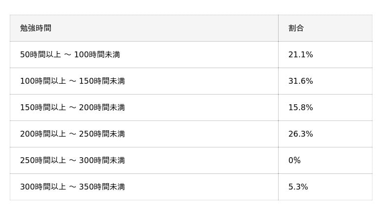 最も多かった回答は、勉強時間が100時間以上 ~ 150時間未満の31.6%、受験回数は1回の52.6%、年齢は40代の31.6%でした。