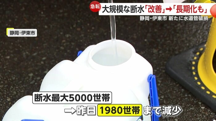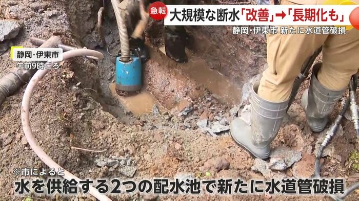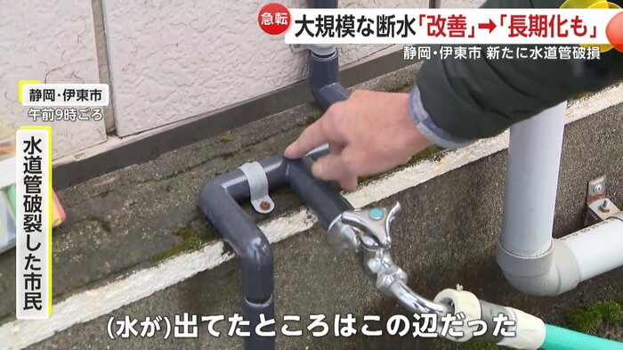 一方、静岡・伊東市でも、水道管が破裂し水が漏れ出している。