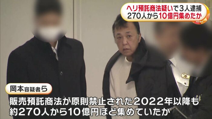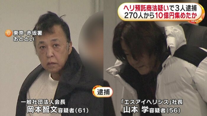 航空関連事業を展開する一般社団法人の会長・岡本智文容疑者や「エスアイヘリシス」の社長、山本学容疑者ら3人は2022年、ヘリコプターの所有権を購入すれば運用利益を還元するとうたい、違法な預託契約を結んだ疑いが持たれている。