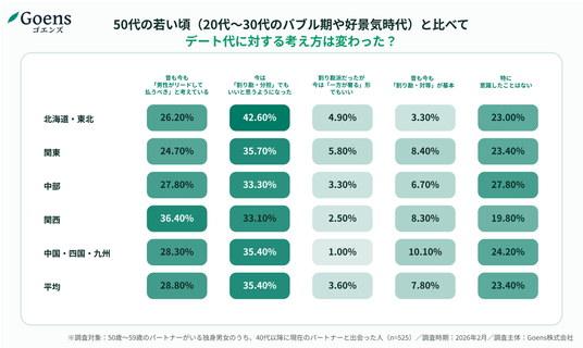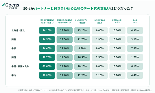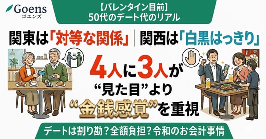 50歳以上限定のマッチングアプリ「Goens(ゴエンズ)」(運営:Goens株式会社/本社:愛知県名古屋市/CEO : 廣澤 和也)は、「40代以降に現在のパートナーと出会った」50代独身男女を対象に、デート代の実態調査を実施しました。