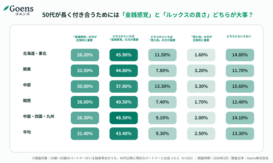 デート代の支払いに対して地域ごとの違いはあるものの、全体の74.8%が「見た目」よりも「金銭感覚の一致」を重視すると回答。背伸びをせず、価値観が合う相手と人生後半を共にしたい想いは全国共通といえる。