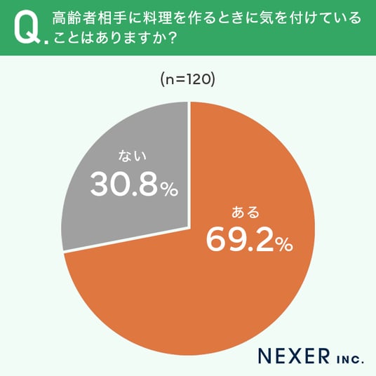 その結果、69.2%が「ある」と回答しました。約7割が、何らかの配慮をしながら料理を作っていることがわかります。一方で、30.8%は「ない」と回答しており、普段と同じように作っている方も一定数いるようです。