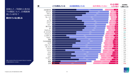 また、日本で「恋愛や性生活」に満足していると回答したのは33%であり、2025年から6ポイント減少、29か国中最も低い満足度となっています。(グラフ2)