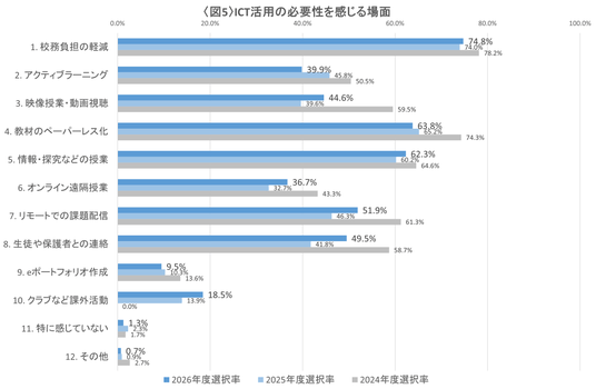 ICT活用の必要性を感じるポイントについての意識調査では、昨年度減少傾向にあった「映像授業・動画視聴」「オンライン遠隔授業」「リモートでの課題配信」「生徒・保護者への連絡」が、それぞれ4~7ポイント程度増加となりました。〈図5〉