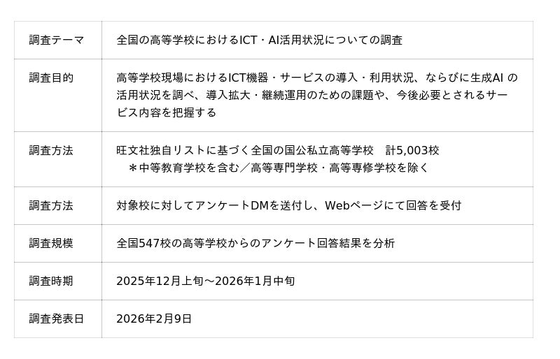 教育出版の株式会社旺文社(本社:東京都新宿区、代表取締役:粂川 秀樹)は、高等学校におけるICT機器・サービスの導入・利用状況および生成AIの活用実態について、アンケート調査を実施いたしました。今年で10回目となる本調査では、全国547校の高等学校から回答を集計。直近の実態調査に加えて、10年間の推移データを基にした動向分析を行いました。
