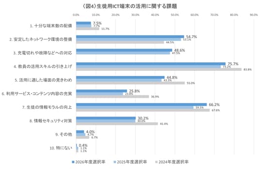 「十分な端末数の配備」を課題に挙げる割合は、1人1台の端末配備が浸透した2022~2023年度に急落。ただ、2025年度から選択肢に加えた「充電切れや故障などへの対応」は5割弱と高い回答割合で、運用面での課題はいまだに根強いようです。