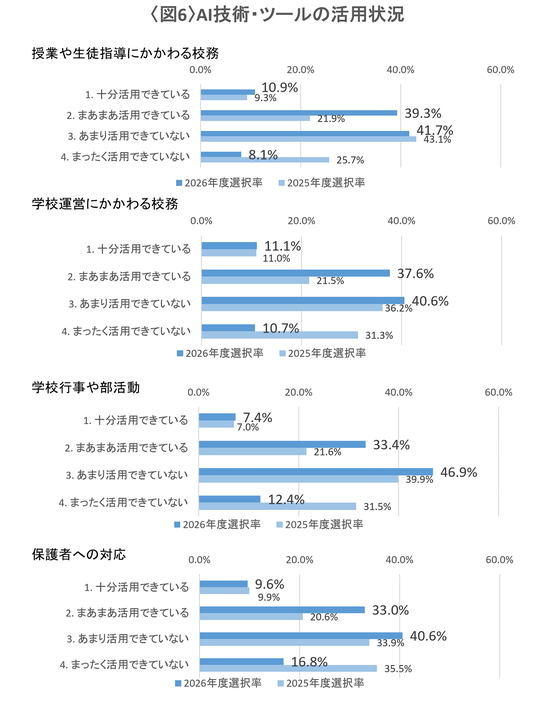 昨年度から設問に加えた生成AIの活用についての調査では、「授業や生徒指導にかかわる校務」「学校運営にかかわる校務」「学校行事や部活動」「保護者への対応」の4項目すべてで、「まあまあ活用できている」の回答割合が大幅増、「まったく活用できていない」の割合が大幅減となりました。