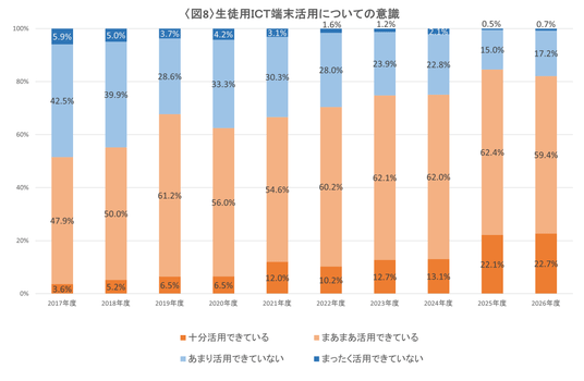 10年前の2017年度調査では、「活用できている」意識と「活用できていない」意識の高等学校が、およそ半数に二分されていましたが、徐々に「活用できている」派が増え、2025年度以降は8割を超えています。〈図8〉