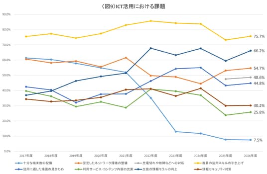 また、コロナ禍中の2022年度から「生徒の情報モラルの向上」の回答割合も急激に伸び、最新の調査でも66.2%と存在感を示しています。生徒への教育や情報管理については、ICTを通したコミュニケーションの難しさや、利用サービスの増加に伴うアカウント管理の煩雑さも課題に挙げられています。