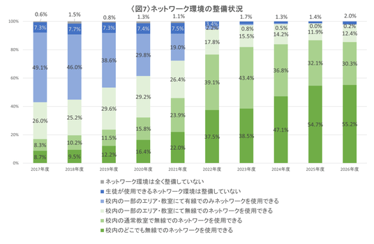 モバイル端末配備の拡大と合わせ、2023年度には「通常教室で無線ネットワークを利用できる」高等学校が8割を超えました。