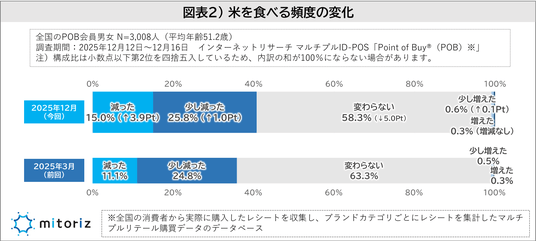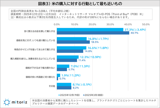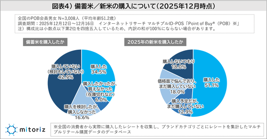 株式会社mitoriz(本社:東京都港区、代表取締役社長:原田光幸)は、消費者購買行動データサービス「Point of Buy(R)(以下、POB)」の会員3,008人を対象に「米に関する調査(2025年12月)」を実施しました。