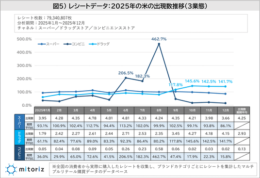 2025年も「米」が価格高騰や備蓄米の放出などで大きな注目を集めた一年となりました。そんな「米」について、前回調査との比較に加え、レシートデータによる業態別の出現数の推移を分析しまとめました。