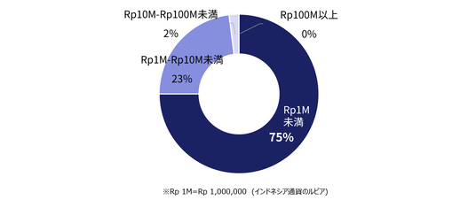 被害件数自体は多いものの、約75%は「月間Rp 1,000,000(9,329円※2026年1月7日時点)」以下の損害に集中。ただし23%は月間Rp 1,000,000~Rp 10,000,000(9,329~93,290円※2026年1月7日時点)の範囲に入り、全体からみると1~10万円程度の被害が多くなっています。