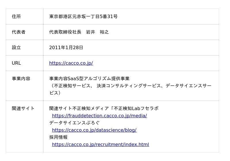 Caccoは、「未来のゲームチェンジャーの『まずやってみよう』をカタチに」という経営ビジョンを掲げ、セキュリティ・ペイメント・データサイエンス技術をもとに、アルゴリズム及びソフトウエアを開発・提供し企業の課題解決やチャレンジを支援することを目指しております。