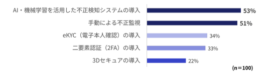多くの事業者が手動によるモニタリング、不正検知システムを活用し対策している割合が5割以上でした。一方、日本で最も対策として多い3Dセキュアの導入はわずか22%となっていました。