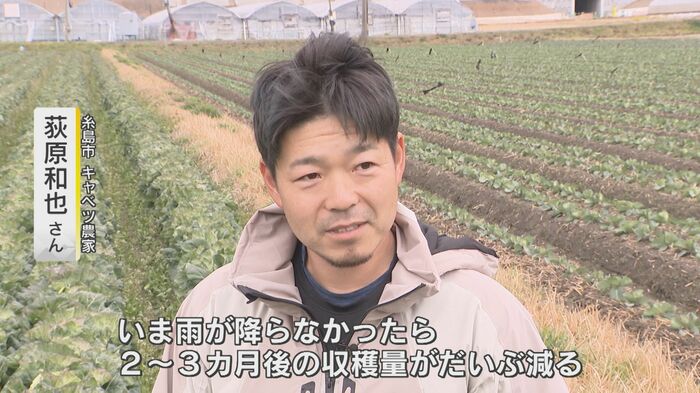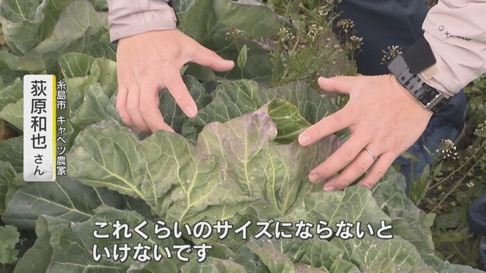 「これくらいのサイズにならないといけないです」と両手で本来のサイズを示すのは糸島市でキャベツ栽培を営む荻原和也さん。両手で示したサイズよりも畑のキャベツは、ふたまわりほど小さい。