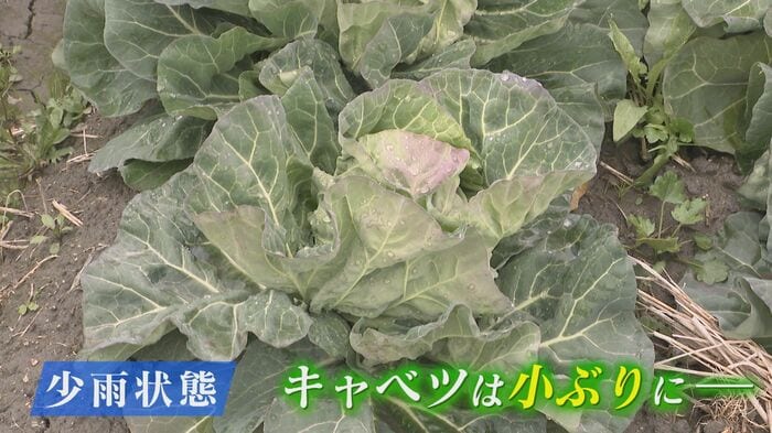 2月10日から11日にかけて久し振りに雨が降ったものの、これまでの少雨状態が影響して、キャベツは通常よりもひと回りほど小ぶりだという。