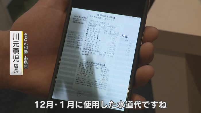 「12月、1月に使用した水道代は10万4830円です。186トン」と明細が記されたスマホ画面を取材陣に提示する川元店長。