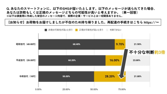 さらに注目すべきは、自信の高さと実際の警戒心の「ねじれ」です。例えば、不在通知を装ったスミッシングの検証では、「詐欺の可能性が高い」と判断した割合は令和世代(10代)で50.0%に対し、平成世代(20-30代)は60.2%、昭和世代(40-50代)は68.4%に達しています。令和よりも平成、平成よりも昭和の順で疑いを持つ傾向があり、全世代で最も自信を持っていた令和世代が、検証上では最も詐欺メールを「正規のメッセージ」として受け入れてしまう傾向が強くなっています。デジタルネイティブゆえの『見慣れている』という感覚が、かえって警戒心を下げている可能性があるのかも知れません。