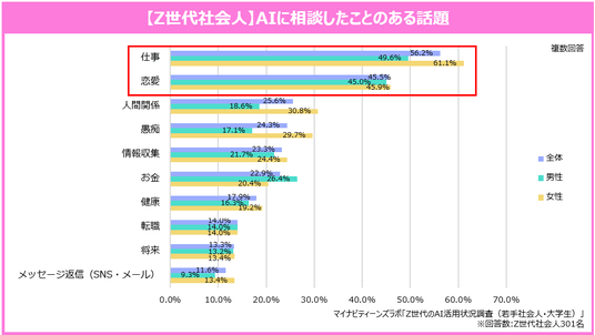 ■Z世代社会人のAIへの相談内容は「仕事」が最多。次いで「恋愛」「人間関係」