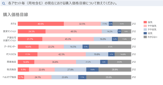 アセット毎の購入価格目線では「強気」回答単体では「ホテル」が最も多く回答を得、「やや強気」回答も含めると「賃貸マンション」が僅差で最も回答を得る結果となった。