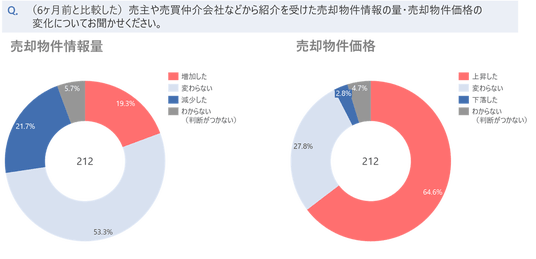 6ケ月前と比較した売却物件情報量は「変わらない」の回答が過半となったが、売却物件価格について「上昇した」とする回答が最も多い結果となった。