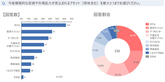 今後積極的な投資や市場拡大が見込まれるアセット(用地含む)では「ホテル」が最も回答割合が高く、次点で「賃貸マンション」が続く結果となった。