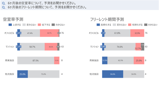 アセット毎6ヶ月後の空室率予測につき、全アセットで「変わらない」が最も多いものの、「オフィスビル」の「低下する」という回答割合が多く、フリーレント期間予測も同様に「オフィスビル」の「短期化する」という回答が目立つ。