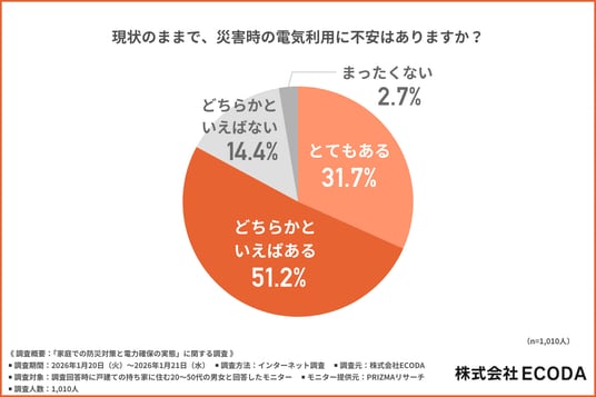 そこで今回、太陽光発電と蓄電池施工を専門に手がける株式会社ECODA(エコダ)は、戸建ての持ち家に住む20~50代の男女を対象に、「家庭での防災対策と電力確保の実態」に関する調査を行いました。