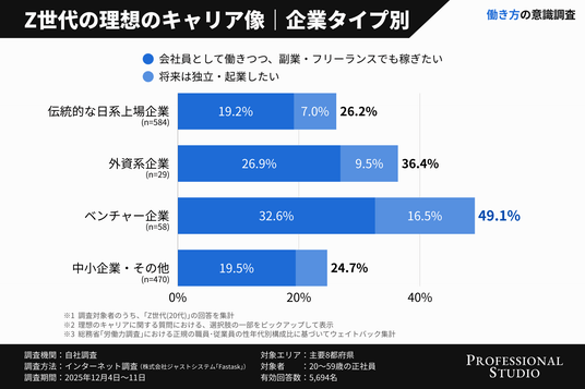 「会社員として働きつつ、副業・フリーランスでも稼ぎたい」と「将来は独立・起業したい」を合計した「独立・副業志向」を持つ人の割合は、ベンチャー企業社員では49.1%に達しました。これは、伝統的な日系上場企業社員(26.2%)の約1.9倍にあたり、両者の間には大きな意識の差が見られます。