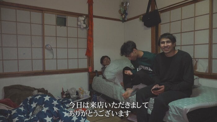 取材中、ルームメイトの一人がアルバイトから帰宅した。3人は同じ飲食店でアルバイトをしている。