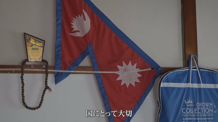 壁にはネパールの国旗が飾られていた。故郷を離れた若者たちの心の支えとなっているようだ。