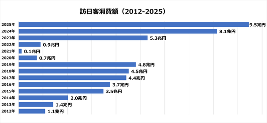 2025年の訪日客旅行消費額は約9.5兆円(2024年対比+16.4%)となり、過去最高額を更新しました。2012年の1.1兆円から13年間で約8.6倍へと拡大しており、インバウンド市場の成長スピードを裏付ける結果となっています。