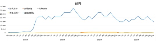 また、訪日客の多い韓国・台湾のキーワード別の検索数をみると、韓国は「沖縄旅行」が圧倒的に多く、台湾は「北海道旅行」が最も多い結果となりました。2025年は、地方空港への国際定期便やチャーター便の復便・増便が相次ぎました。特に韓国や台湾からの直行便が大幅に増え、アクセスが向上したことが、増加につながったと読み取れます。