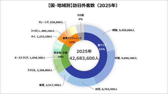 国・地域別では、1位が韓国945万人(2024年対比+64万人、+7.3%)、2位が中国909万人(2024年対比+211万人、+30.3%)、3位が台湾676万人(2024年対比+71万人、+11.9%)となりました。