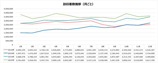 2025年の訪日外国人客(以下、訪日客)数*1は約4,268万人に達し、2024年を約580万人上回り、年間の過去最高記録を更新しました。さらに月別でもすべての月で2024年を上回る結果となりました。