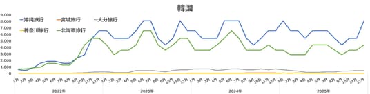 以下は、調査した8ヶ国・地域*の「沖縄旅行」、「宮城旅行」、「大分旅行」、「神奈川旅行」、「北海道旅行」の検索数の合計値をまとめたものです。これら5県は、2025年10~11月の都道府県別宿泊者数トップ20において、2024年と比較して東京・大阪・京都など主要都市となる観光地以外で宿泊者数が多かった県です。オーバーツーリズムを避け、日本の「地方ならでは」の魅力を求める観光客が増えたと考えられます。